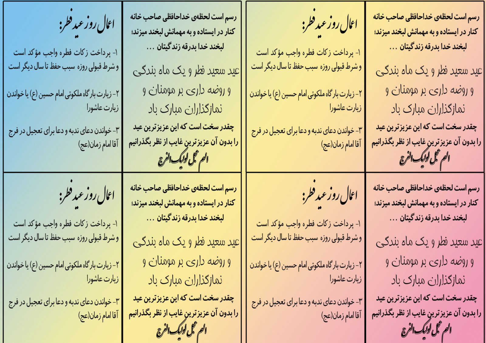 در این قسمت تراکت های ویژه عید سعید فطر را برای دوستان قرار میدهم.این تراکت ها در عید فطر امسال بعد از نماز عید به همراه بسته ای میان نمازگزاران پخش شد.برای دانلود برروی ادامه مطلب کلیک کنید.